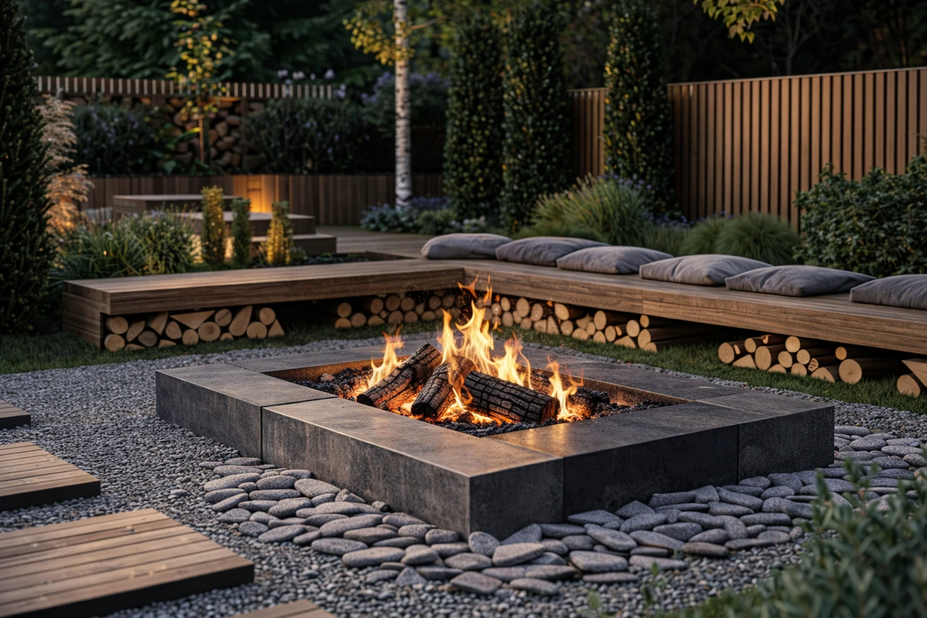 - Designový rámec pro dřevo – umístěte kamenné prvky (např. větší valouny nebo pruhy štěrku) kolem místa, kde skladujete palivové dřevo. Díky tomu vznikne pocit organizovaného a promyšleného designu, který podtrhuje hlavní prvek prostoru: oheň.